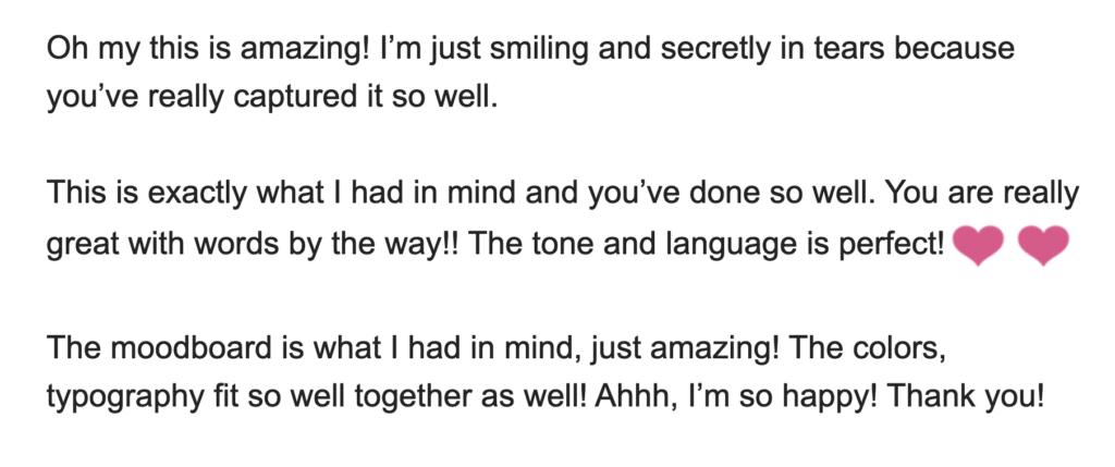 Your business has something meaningful to share, and I want to help you make that clear to everyone your business comes into contact with. On our call, I’ll help you clarify what next steps make sense for your business and (if we’re a good fit!) how we might work together to elevate your brand.