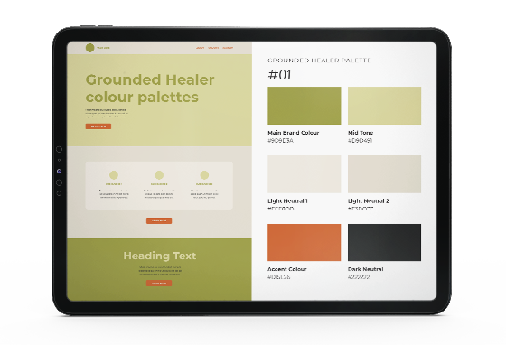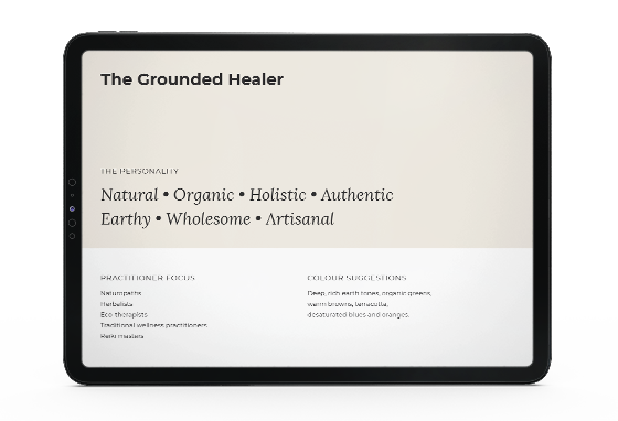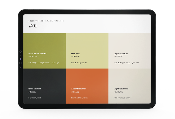 Every palette is categorised under an archetype such as The Nurturing Supporter, The Serene Sanctuary, and The Empowering Catalyst, so you can choose the one that truly reflects your unique service and approach.